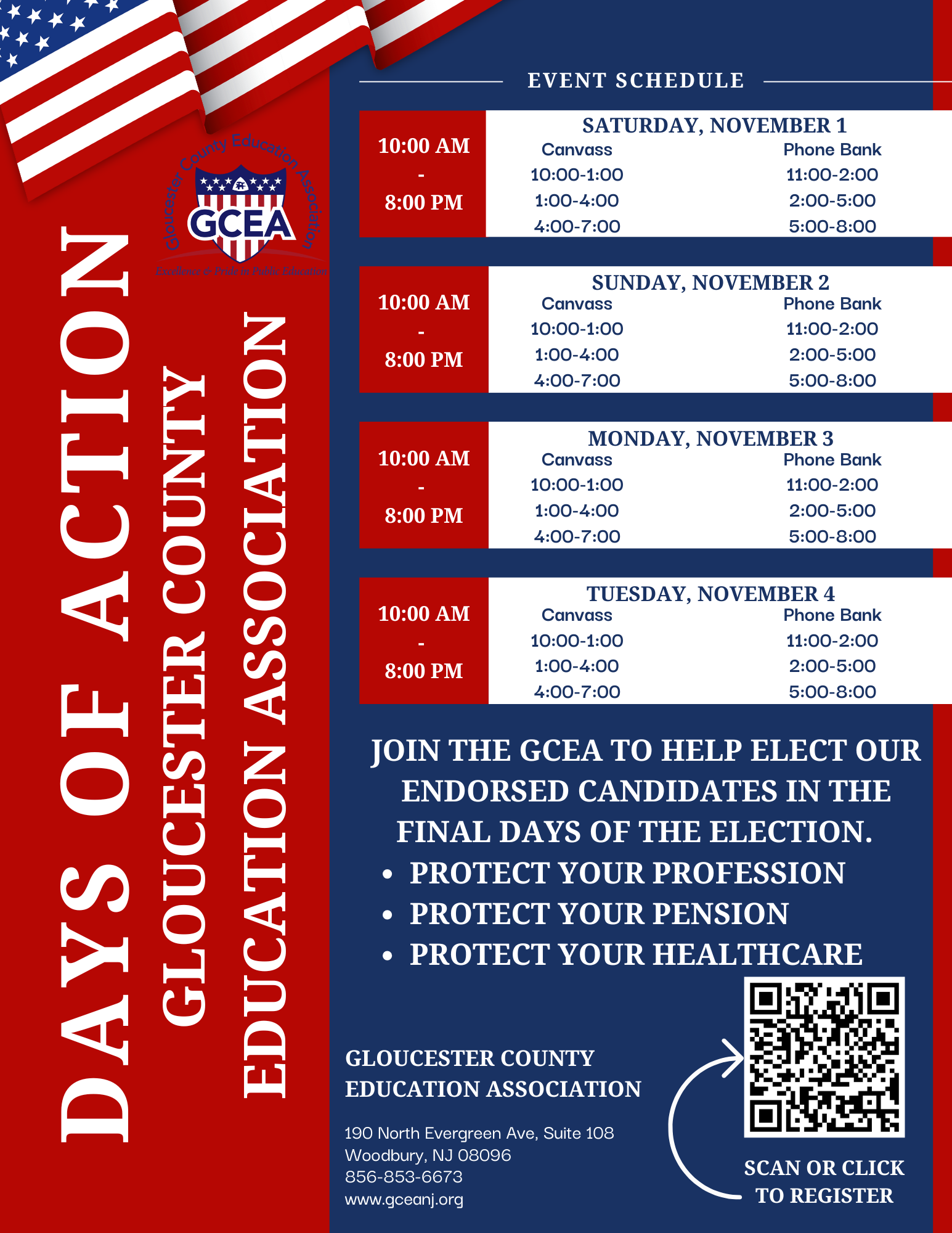 We will be doing canvassing and phone banking the final days leading up to Election Day to help get our endorsed candidates elected, November 1-4. Canvasses are at 10:00, 1:00, and 4:00 and phone banks are at 11:00, 2:00, and 5:00 each day.